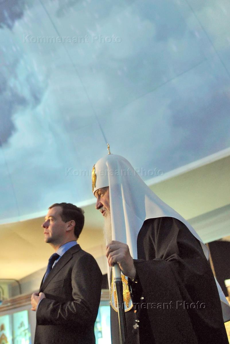 Президент России Дмитрий Медведев (слева) и Патриарх Московский и всея Руси Кирилл (справа) на…
