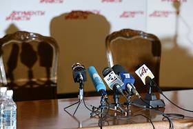 Микрофоны стоят на столе перед началом пресс-конференции в пресс-центре газеты "Аргументы и Факты".