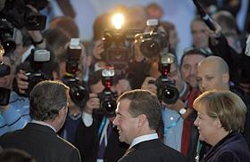 Президент России Дмитрий Медведев (в центре), федеральный канцлер Германии Ангела Меркель (справа) и…