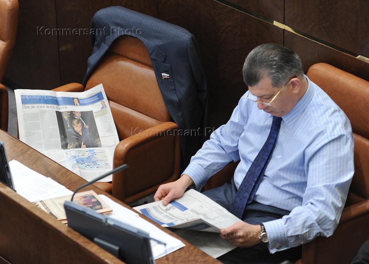 Сенатор читает газету "Коммерсантъ" на заседании Совета Федерации России.
