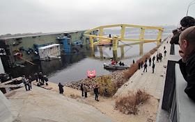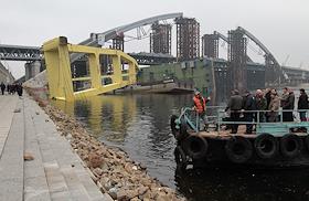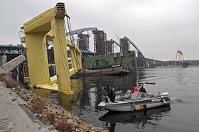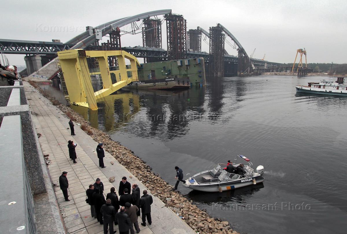 Место крушения крана "Захар" грузоподъемностью 680 тонн, использовавшегося при строительстве Подольского моста в Киеве.