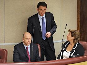 Исполняющий обязанности министра финансов России Антон Силуанов (в центре) на заседании Госдумы.