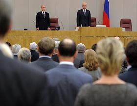 Председатель правительства России Владимир Путин (слева) и председатель Государственной думы России…
