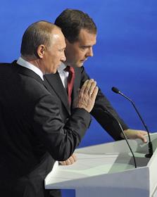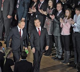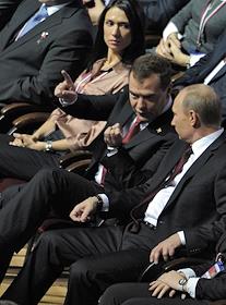 Президент России Дмитрий Медведев (слева) и председатель правительства России Владимир Путин…