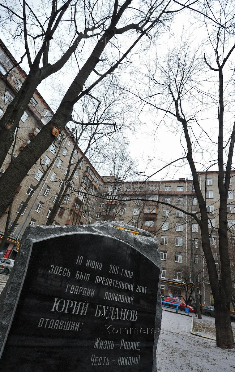 Мемориальная плита во дворе дома 38/16 на Комсомольском проспекте, где в июне был застрелен бывший полковник российской армии Юрий Буданов.