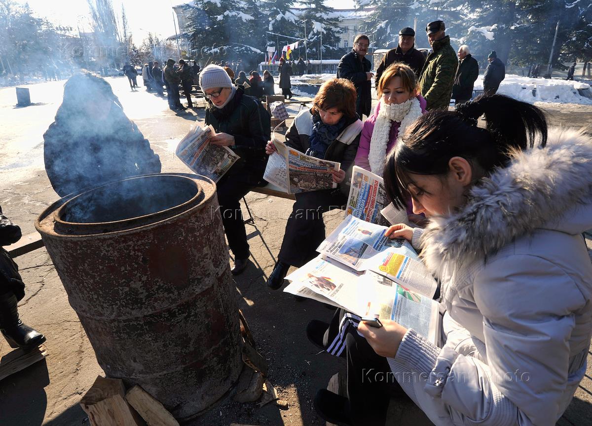 Сторонники кандидата в президенты Южной Осетии Аллы Джиоевой у костра на центральной площади города.