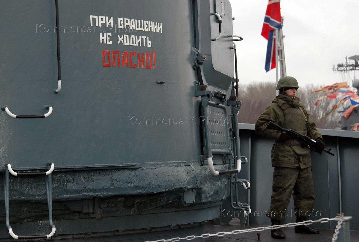 Военные корабли Военно-Морского флота России. Надпись на орудии "При вращении не ходить! Опасно!".