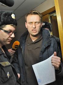 Блогер, основатель проекта "Роспил" Алексей Навальный (слева) после рассмотрения ходатайства о мере…