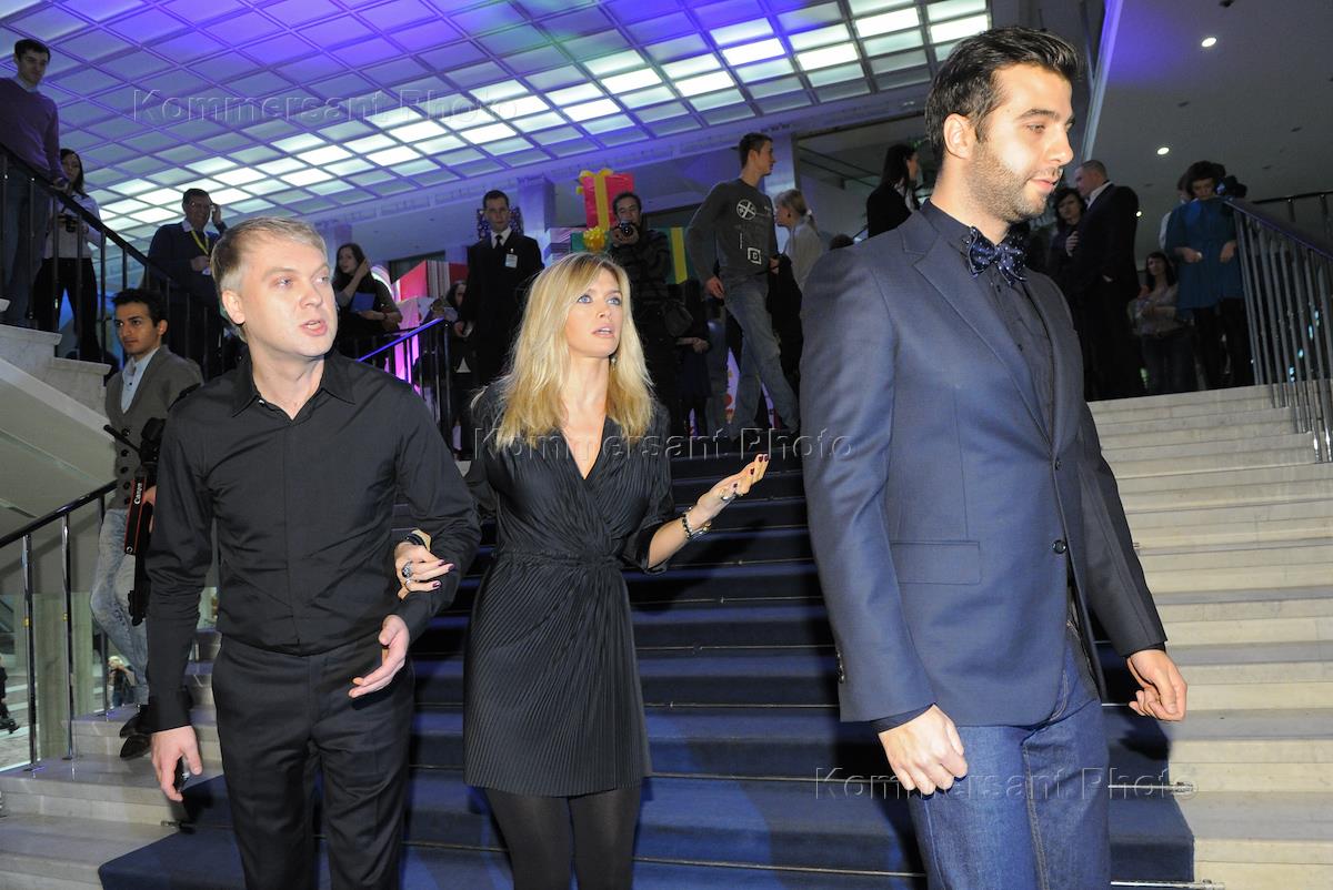 Слева направо: телеведущие Сергей Светлаков, Вера Брежнева, Иван Ургант на премьере фильма "Елки-2"…