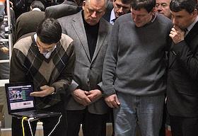 Министр связи и массовых коммуникаций РФ Игорь Щеголев во время монтажа видеокамер для обеспечения онлайн-трансляций выборов президента РФ на городском избирательном участке Великого Новгорода.