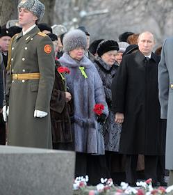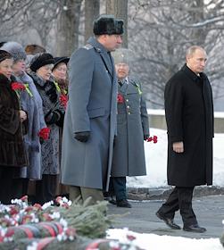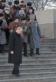 Светская жизнь Визит премьер-министра В.В. Путина в Санкт-Петербург. Председатель правительства России Владимир Путин во время встречи с ветеранами Великой Отечественной войны (ВОв). церемонии возложение венков к скульптуре "Мать-Родина" на Пискаревском мемориальном кладбище.