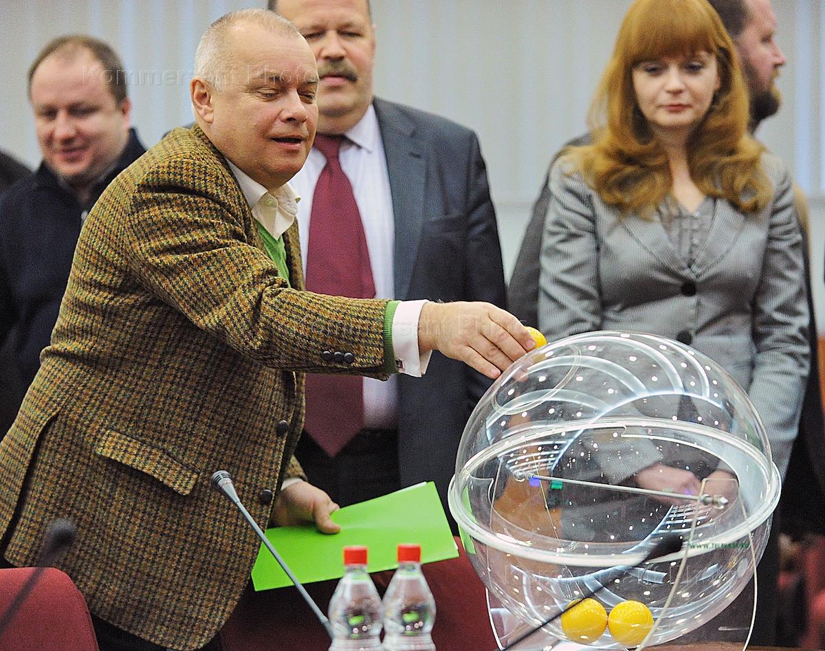 Заместитель генерального директора Первого канала Андрей Писарев (слева) во время жеребьевки…
