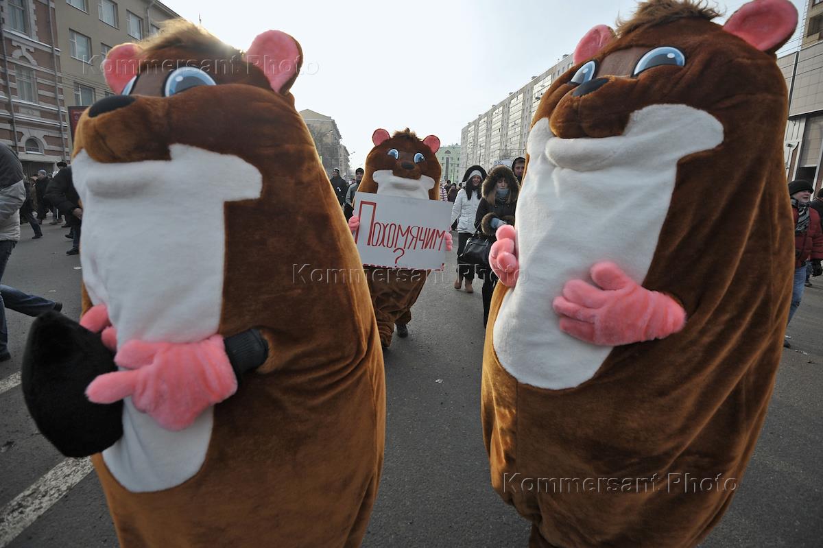 Участники акции в костюмах хомяков с плакатом "Похомячим?". Акция "За честные выборы" прошла в форме…