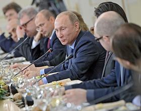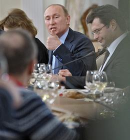 Председатель правительства России Владимир Путин (справа) на встрече с политологами. Встреча прошла…