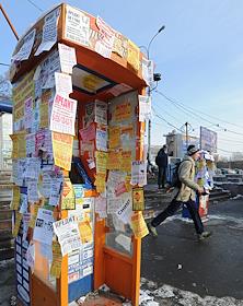 Жанровая фотография. Терминал оплаты сотовой связи и других услуг, обклееный объявлениями.