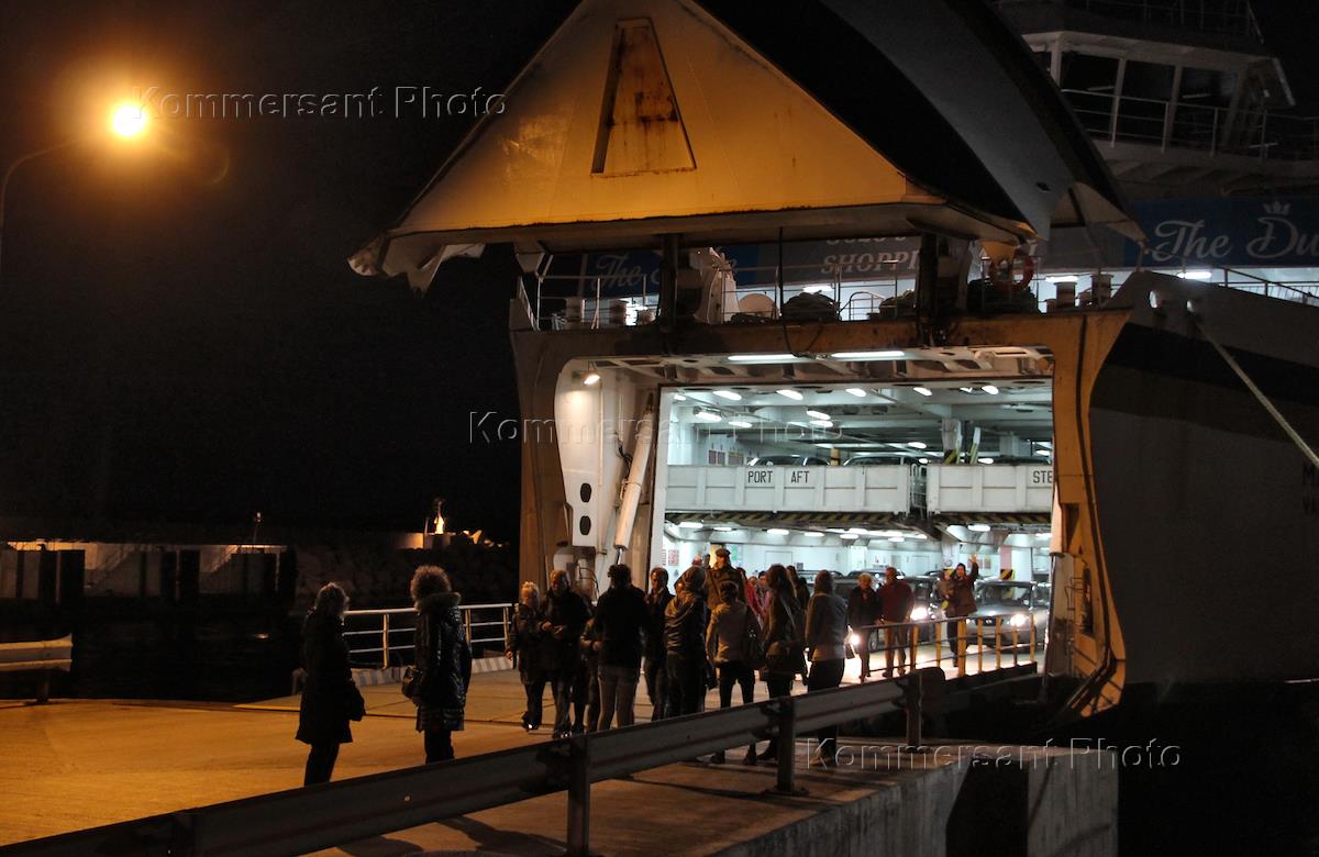 Пассажиры выходят на берег острова Гозо с парома с открытой аппарелью.