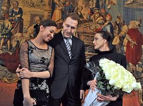 Слева направо: композитор Родион Щедрин, балерина, хореограф Майя Плисецкая, удостоенная звания…