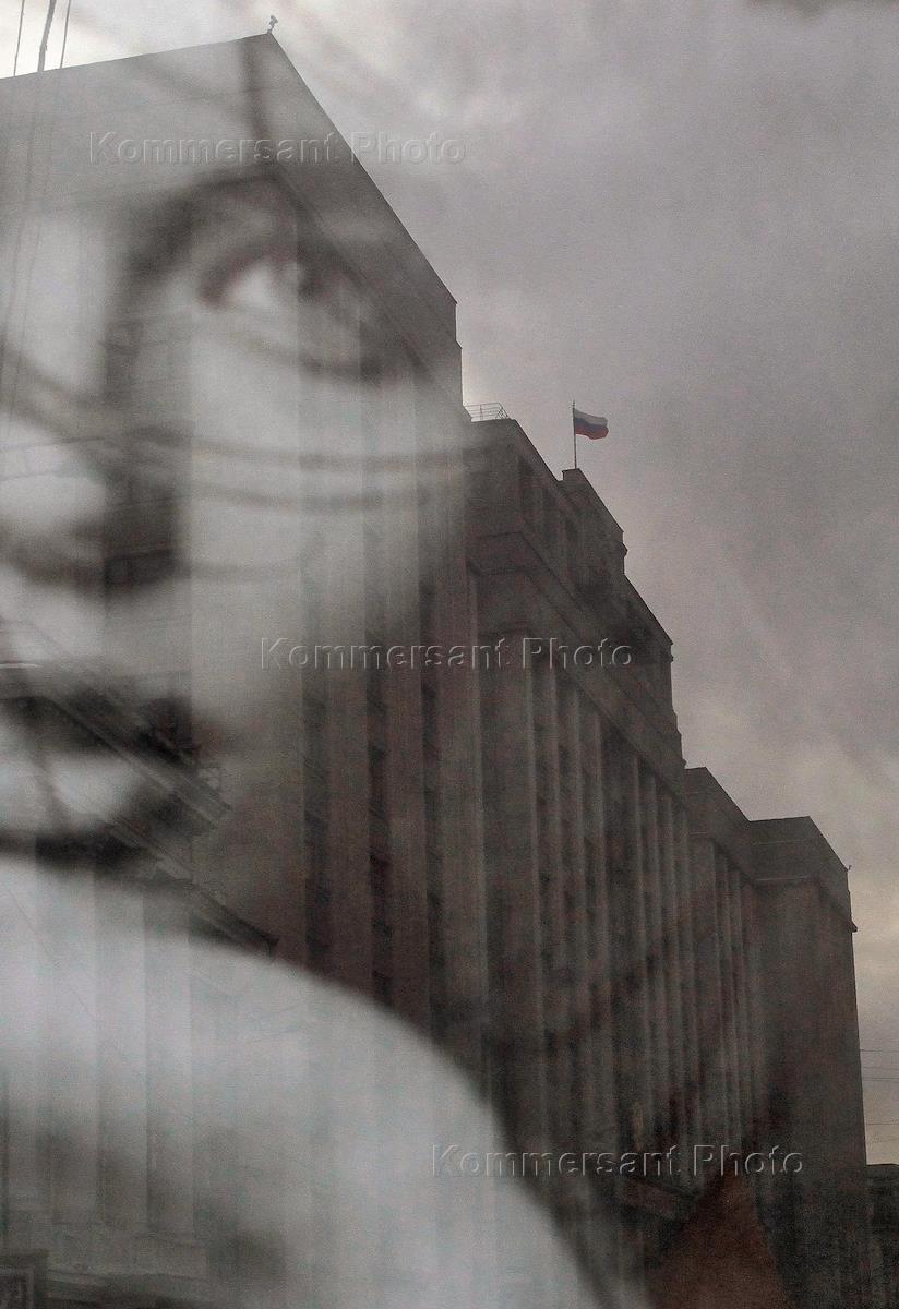Жанровая фотография. Здание Государственной думы России отражается в рекламном плакате фирмы…