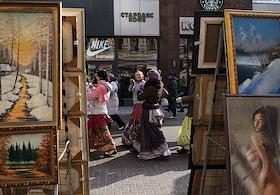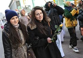 Жанровая фотография. Международный женский день 8 марта. Прохожие на одной из улиц города.
