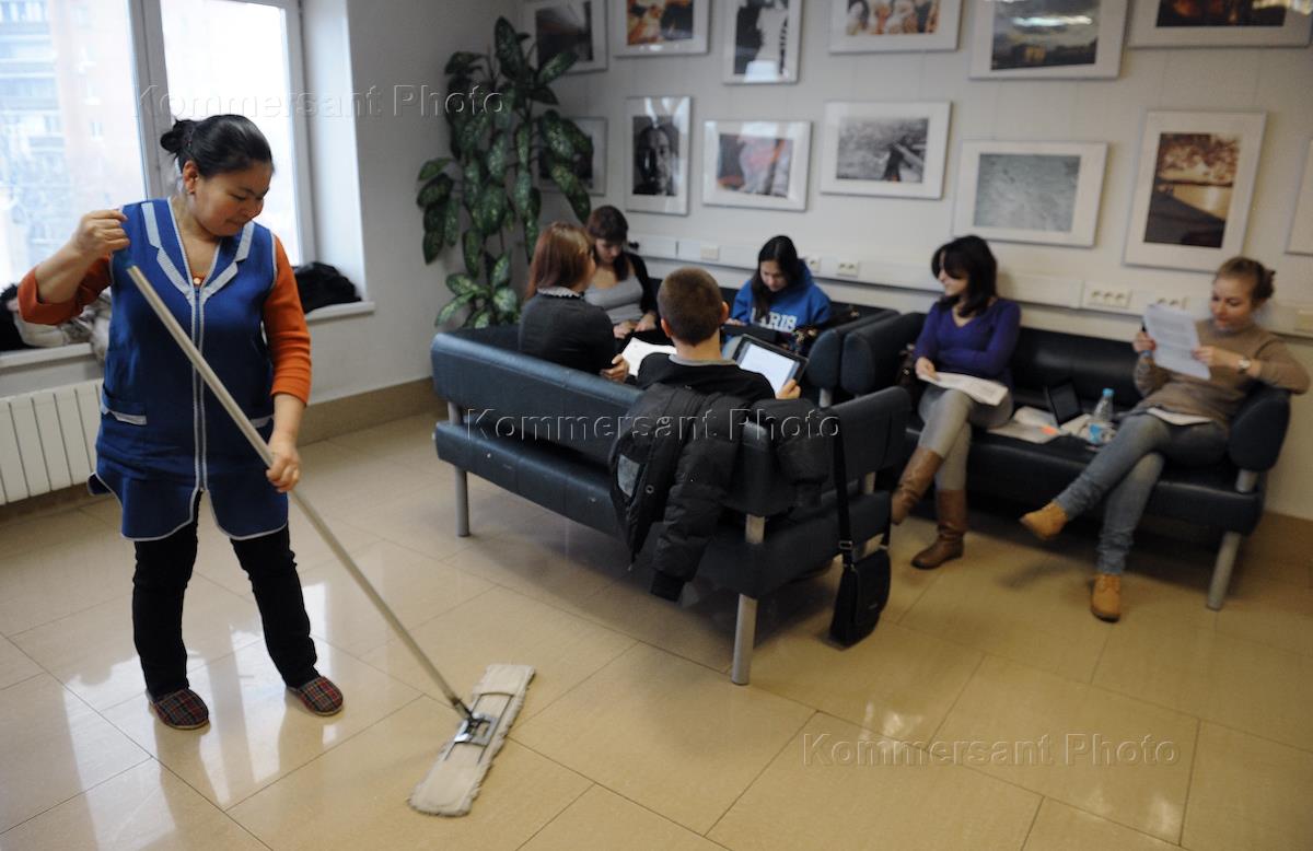 Холл экономического факультета Высшей школы экономики. Уборщица во время работы.