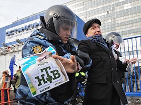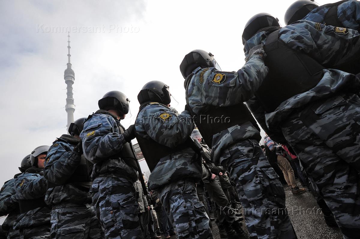 Сотрудники полиции во время задержания участника митинга протеста у телецентра "Останкино" в связи с…