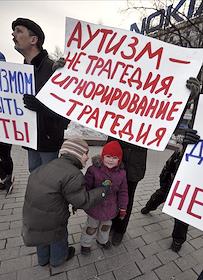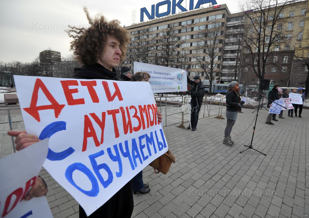 Акция в поддержку детей больными синдромом аутизма. Плакат с надписью "Аутизм - не трагедия,…