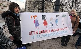 Акция в поддержку детей больными синдромом аутизма. Плакат с надписью "Дети должны учиться вместе."