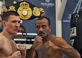 Российский боксер Денис Лебедев (слева) и боксер из Барбабадоса Шон Кокс (справа) на официальной…