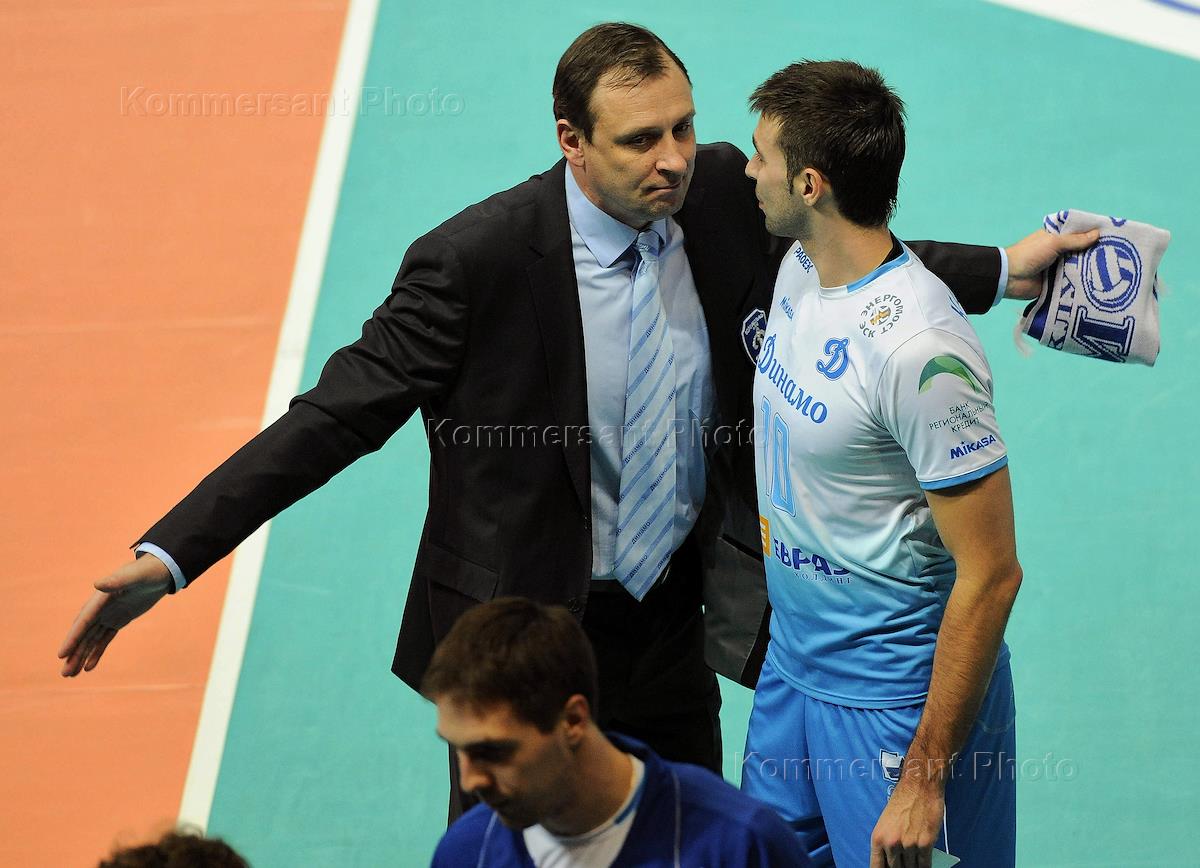 Чемпионат России по волейболу. Игрок команды Дмитрий Калинин (справа) после матча между командами…