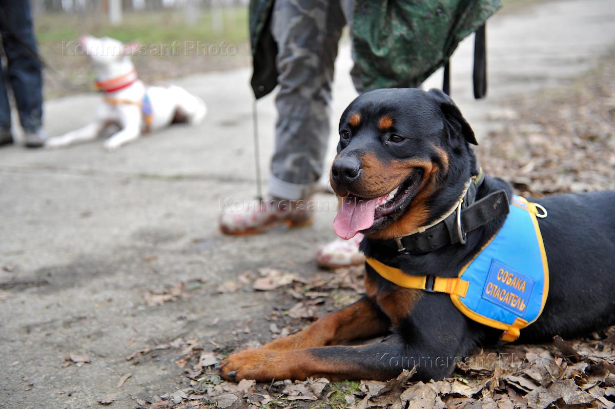 Учения добровольцев МЧС в поселке Апаринки. Собака проды ротвейлер в жилетке с надписью…