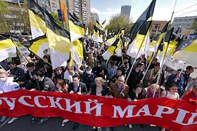 Участники шествия националистических партий "Гражданский марш" на Октябрьском поле. Плакат "Русских…