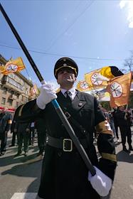 Участники шествия националистических партий "Гражданский марш" на Октябрьском поле. Плакат с…