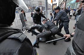 Сотрудники полиции во время задержания участника акции "Не пустим вора в Кремль!", организованной…