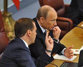 Кандидат на пост председателя правительства России Дмитрий Медведев (слева) и президент России…