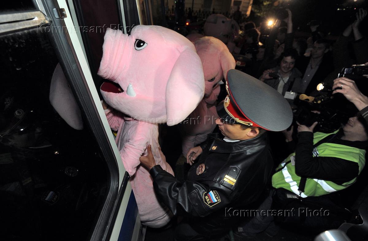 Активисты из прокремлевского движения "Хрюши против" в костюмах свиней в лагере оппозиции на Чистых…