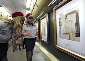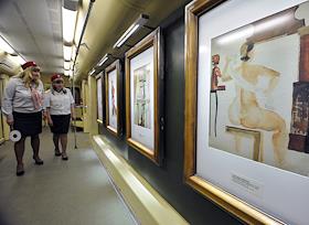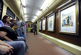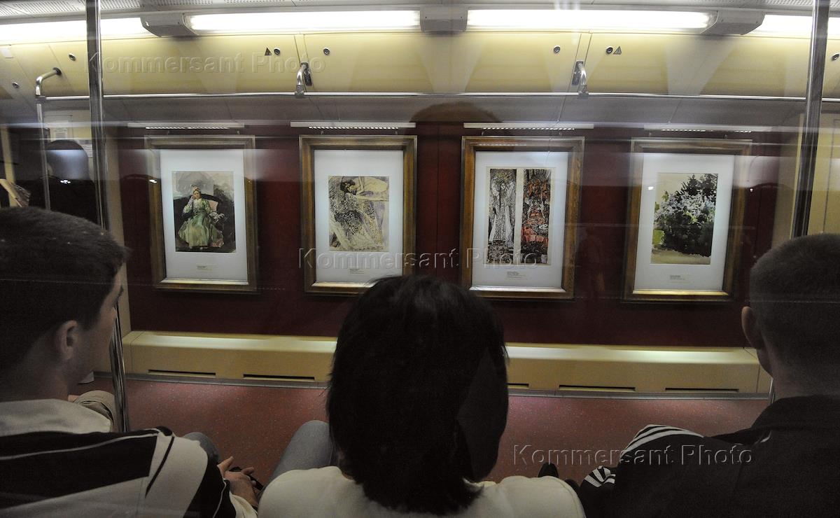 Пассажиры в вагоне поезда "Акварель". Поезд является совместным проектом метрополитена и…