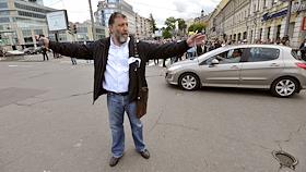 Журналист Сергей Пархоменко во время акции литераторов "Контрольная прогулка" на Чистопрудном…