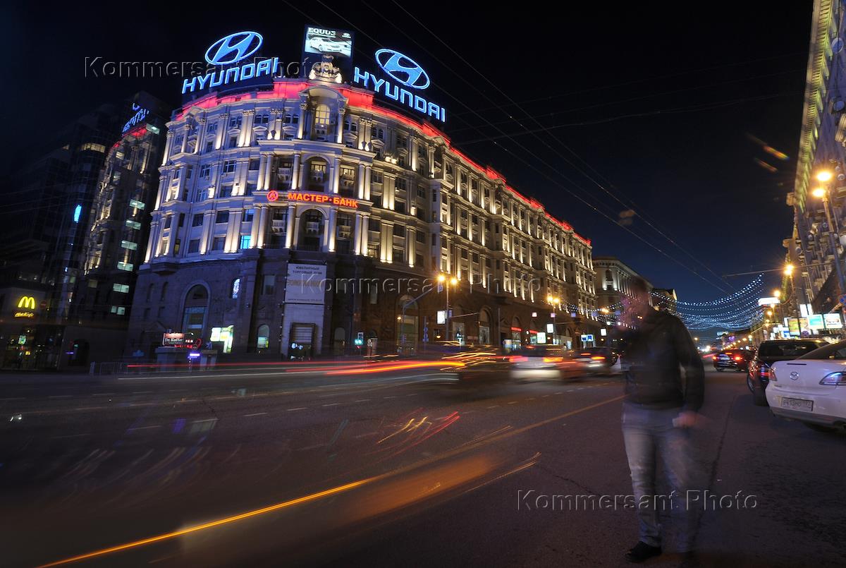Жанровая фотография. Праздничная иллюминация на Тверской улице. Световая реклама компании Hyundai…