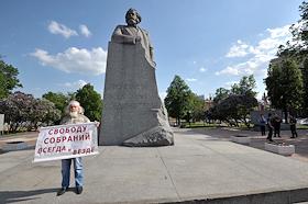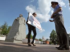 Политика Серия пикетов против внесенных в Госдуму поправок к статье 20.2 КоАП, направленных на ужесточение наказания за административные нарушения за организацию и участие в акциях протеста возле памятника Карлу Марксу на площади Революции.