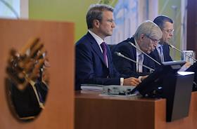 Слева направо: руководитель Рабочего центра реформ при правительстве России Владимир Мау, президент,…