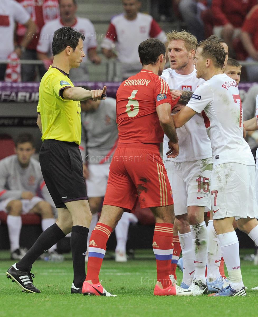 Чемпионат Европы UEFA по футболу "EURO 2012". Слева направо: судья Вольфганг Штарк, игрок сборной…