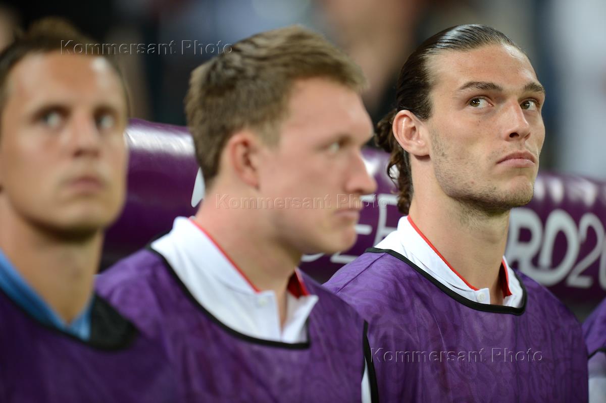 Чемпионат Европы UEFA по футболу "EURO 2012". Игрок сборной команды Англии Эндрю Кэролл (справа) во…