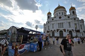 Виды Москвы. Храм Христа Спасителя. Продажа прохладительных напитков на площади у храма.