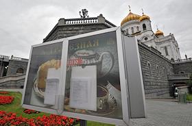 Виды Москвы. Храм Христа Спасителя. Рекламный плакат с меню кафе у храма.