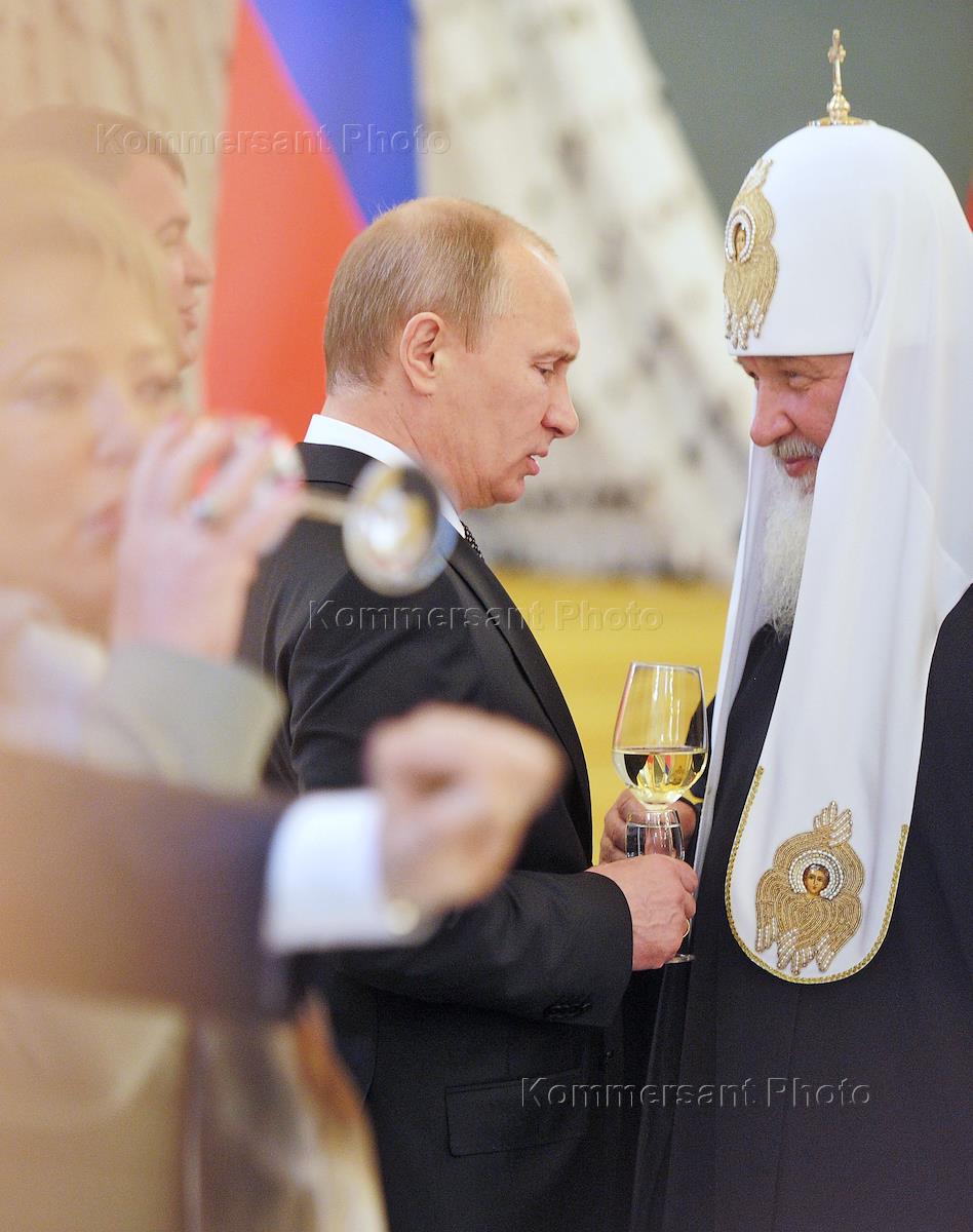 Президент России Владимир Путин (слева) и патриарх Московский и Всея Руси Кирилл (справа) на приеме…