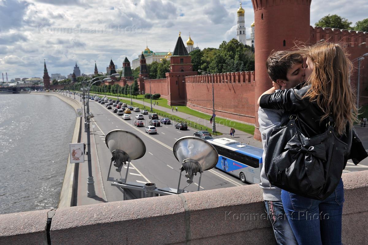 Жанровая фотография. Целующаяся пара на Большом Москворецком мосту черз Москву-реку.