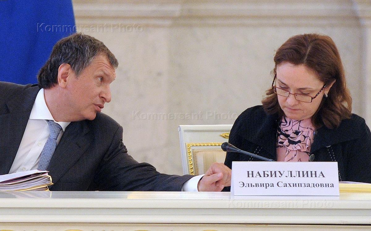Помощник президента России Эльвира Набиуллина (слева) и президент НК "Роснефть" Игорь Сечин (справа)…