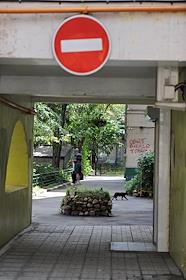 Жанровая фотография. Знак на въезде под арку "Запрещено."