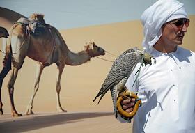 Жанровая фотография. Человек с птицей соколом на руке на фоне плаката с изображением верблюда в…