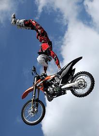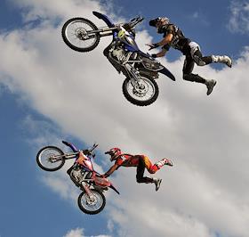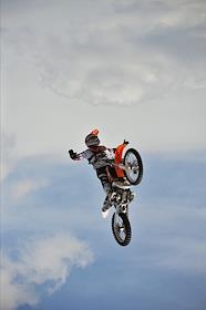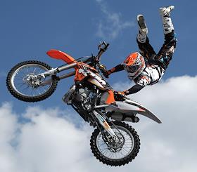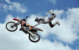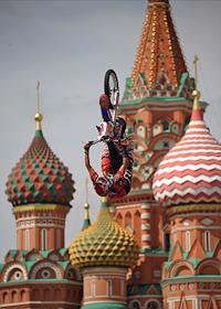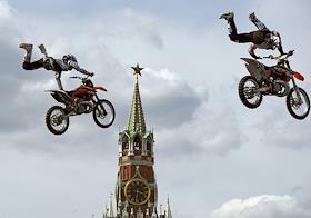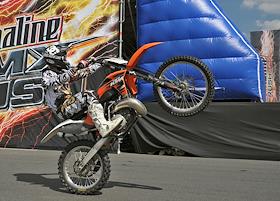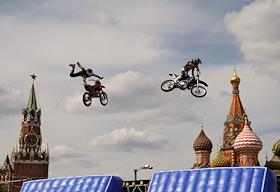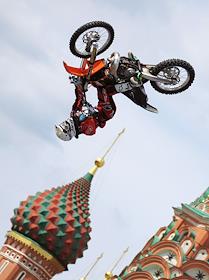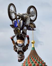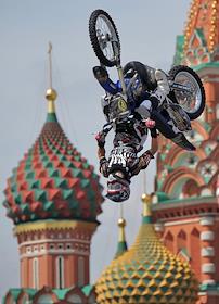 Пятое юбилейное автомобильное шоу Moscow City Racing 2012. Участники FMX мотошоу во время…